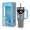 A bold chevron print pays homage to the OG Barbie doll in a black and white vintage swimsuit. Pool blue and hot pink accents complement the iconic cat-eye sunglasses.